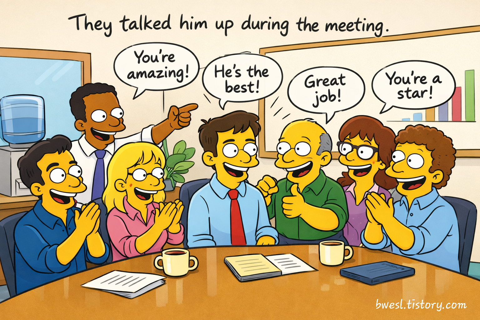 2. 한 단계 더 띄워줄 때: talk someone up = 실제보다 좋게 말하다