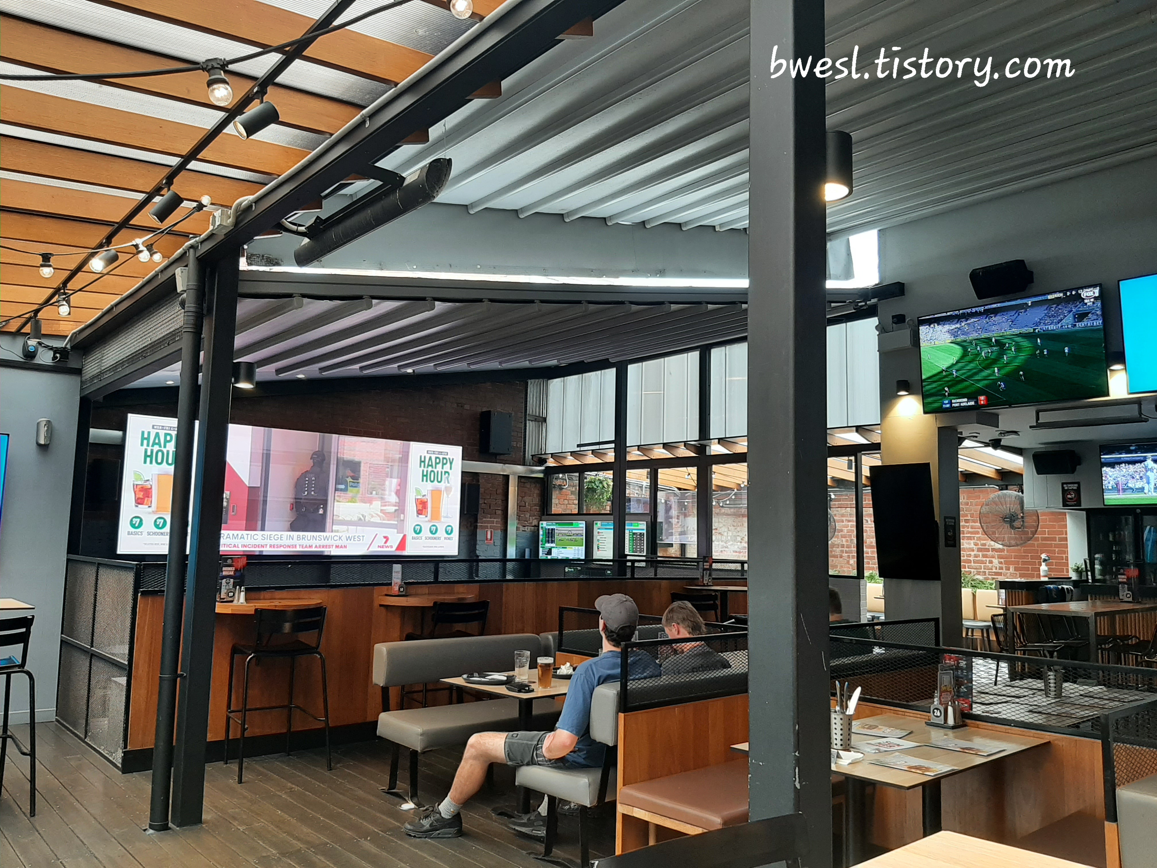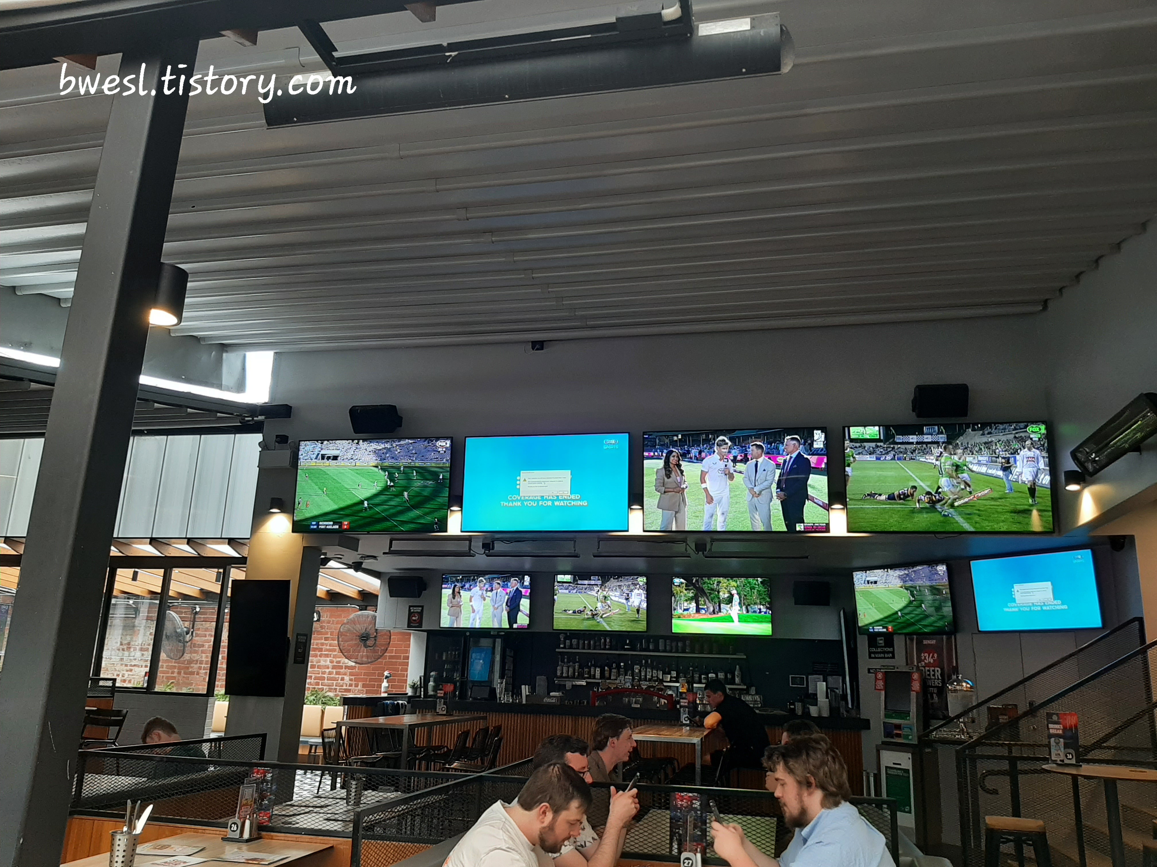 이곳은 질롱 캣츠 홈구장 근처라 경기 날이면 분위기가 시끌벅적합니다. 유니폼 입은 사람들, 맥주 들고 웃고 떠드는 사람들, 경기 전후로 몰리는 인파까지. 여기선 TV가 인테리어라 벽마다, 기둥마다, 심지어 시선이 닿는 모든 곳에 스크린이 있습니다ㅎ AFL, NRL, NBA, EPL 경기 등등.