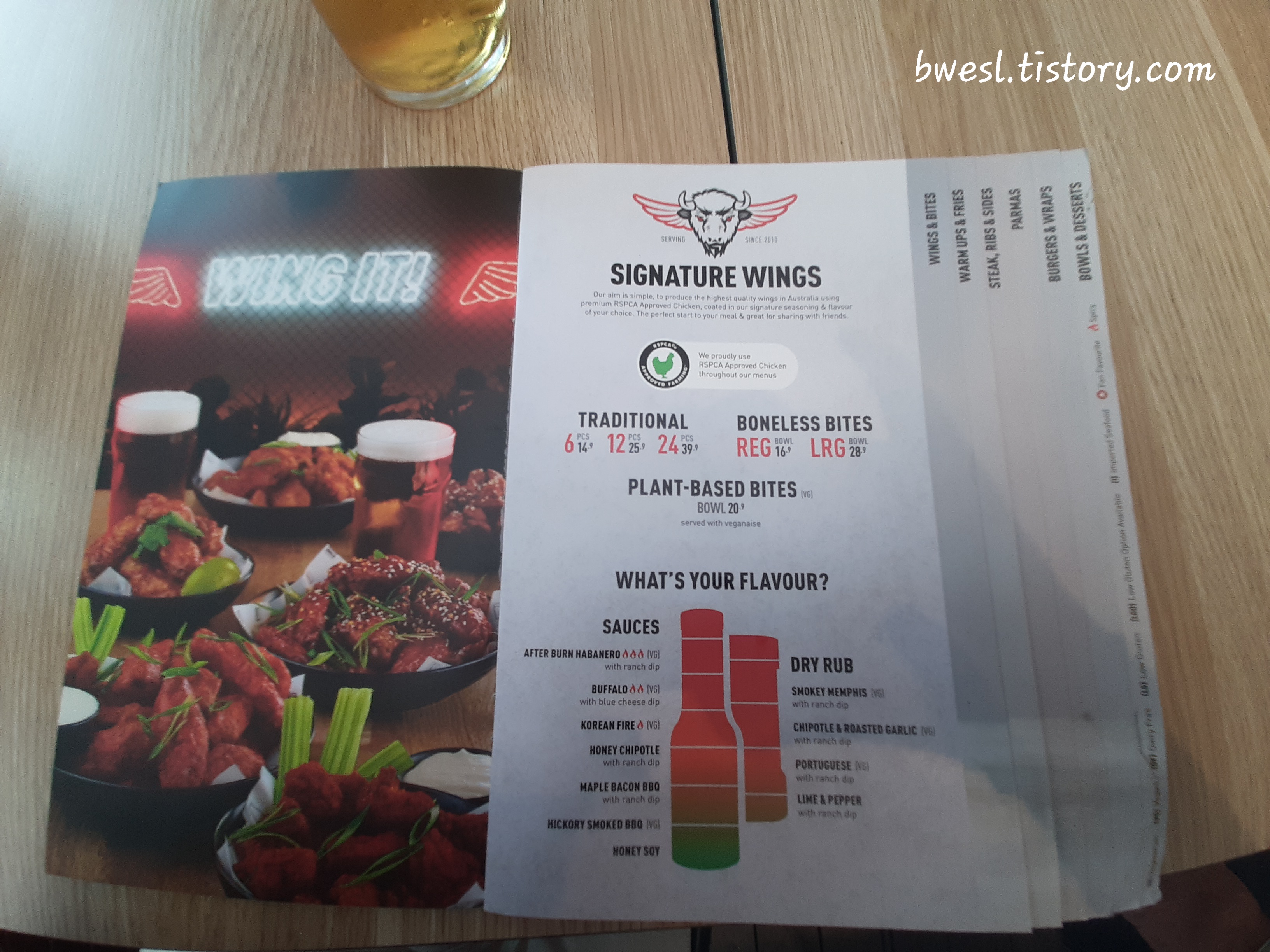 1. 시그니처 메뉴인 윙(Wings)은 이곳에서 가장 많이 주문되는 메뉴로 맛(flavour)을 선택할수 있어요.
